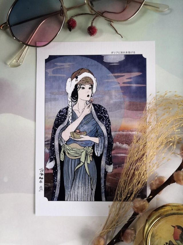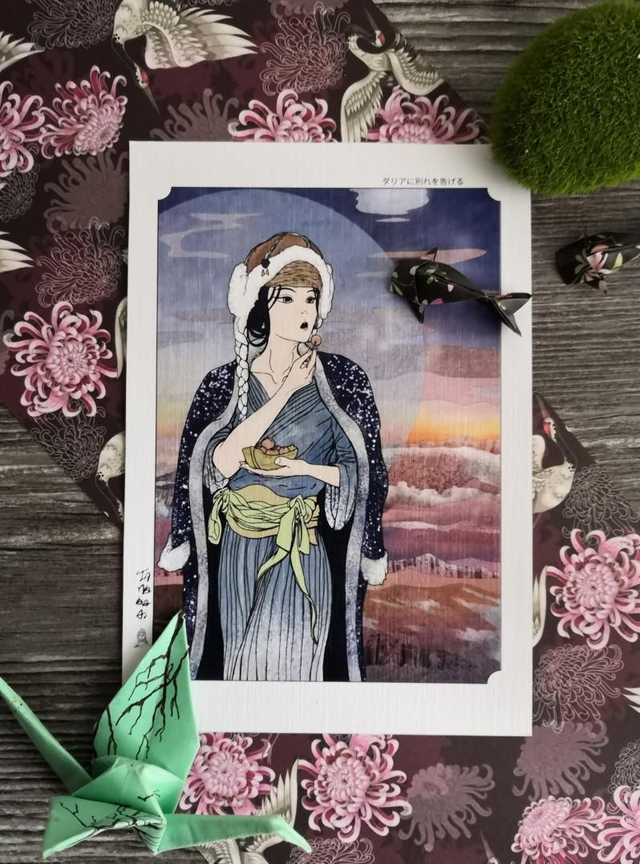 Dieser Kunstdruck ist als Teil meines digitalen Zeichnens entstanden, womit ich Entwürfe für die Essstäbchen anlege. Mich fasziniert die Einfachheit und Schönheit der japanischen Holzschnitte und so ist diesem Motiv dem Holzschnittstil nachempfunden. Mit seinen Farben wirkt es sehr "cozy" und athmosphärisch. Man kann sich vorstellen sie macht eine Pause auf einem Plateau am Rande eines trubeligen Festes im Winter..