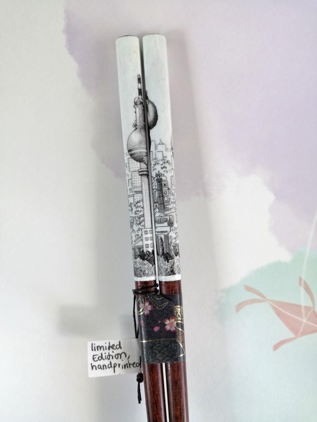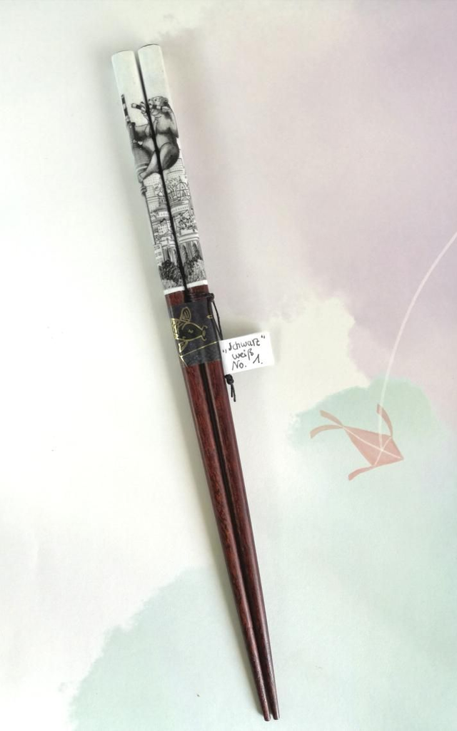 Limited Edition mit bisher 5 Stück. Ein Schwarz-Weiß Illustrationsstück, handgedruckt auf dunkelbraune Essstäbchen mit feiner Spitze.