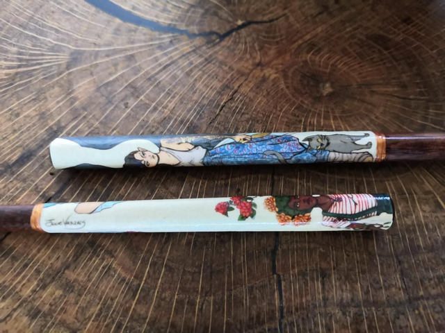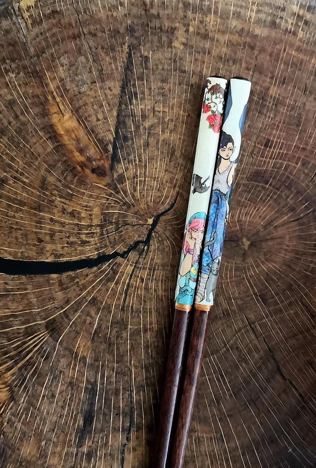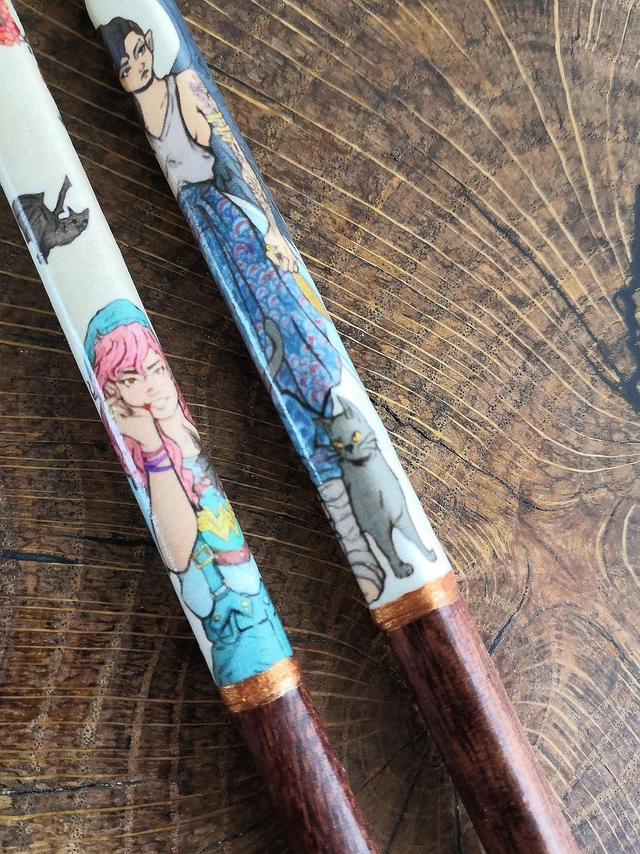Wunderschöne Motive der Brazilianischen Künstlerin Julie Vasques adaptiert auf Chopsticks. Feminin und mystisch mit einem gefallenen Engel, einer Hexe und einer Vampirin! Eine hübscher als die andere. Besonders süß sind die graue schmeichelnde Katze und die zwei kleinen Fledermäuse! Das umlaufende Schwert macht das Motiv auf den schmalen Chopsticks raffiniert und kleine goldene Effekte glänzen an Ohrringen, Ringen und Schwertdetails.