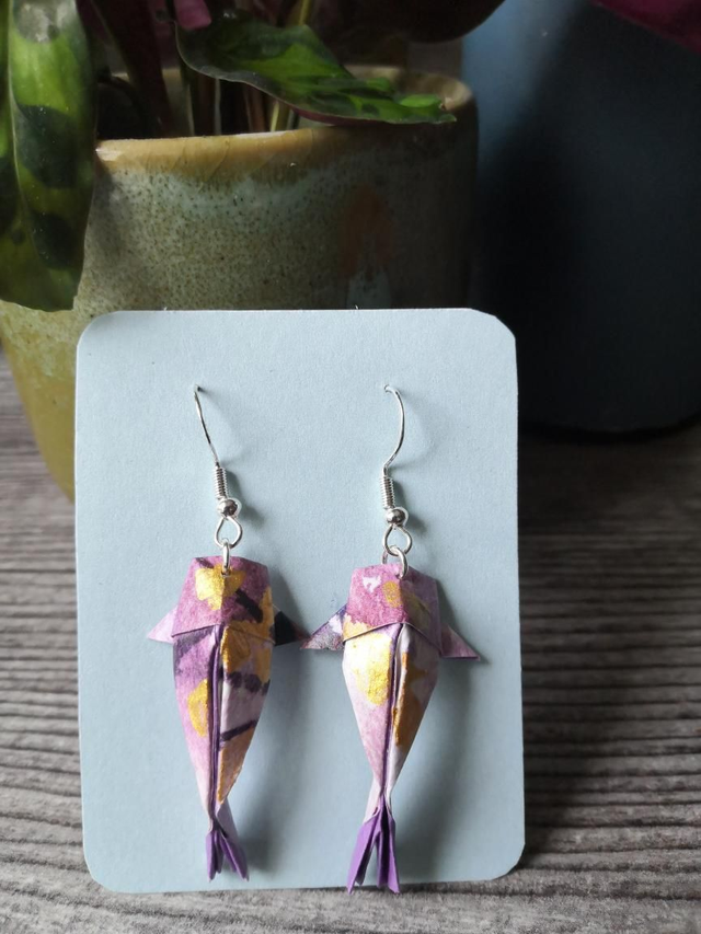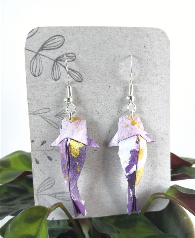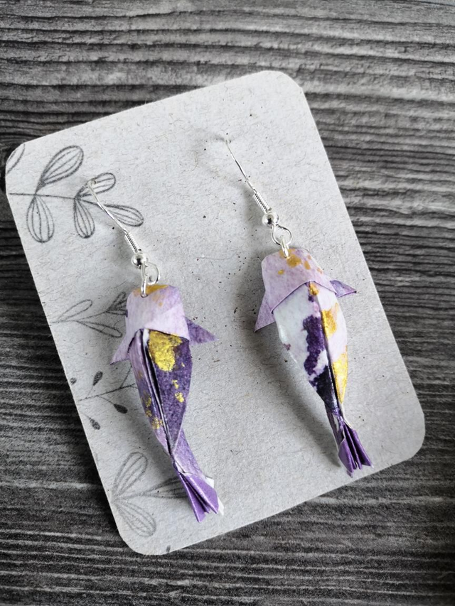 Zarte Lila Muster zieren Das Origamipapier für diese Kawaii Koi Ohrring Variante. Zusätzlich werden Sie mit goldenen Flecken zum Schimmern gebracht.