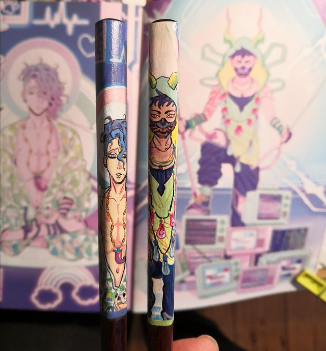 Super detailreiche Zeichnung der Charaktere der Künstlerin und Mangaka Melanie Schober alias maus! aus ihrem Werk Black&Blue. Derek und Gogo im farbvielfältigen kinky Style. Vom Original im Buch handgemalt auf Chopsticks im japanischen Stil mit feiner Spitze. Wer Fan des Mangas ist kennt vielleicht die coolen Extraseiten am Ende der farbigen Mangas, von denen dieses Motiv stammt. Mit Einverständnis der Künstlerin hergestellt!